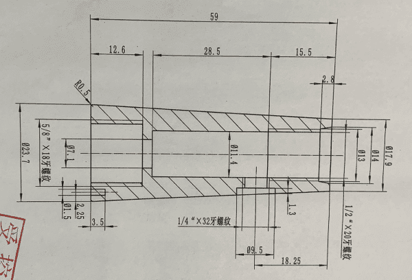 Use a 35°round turning tool to machine a total length of 59mm, then use ∅7.1 drill bit and ∅8 boring tools to machine 1/2×20 thread. Finally, make surface treatment of chrome plated.