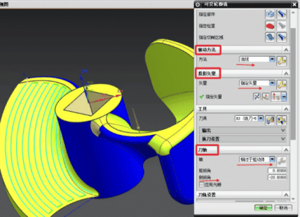 Five-axis programming core three parameters: drive method, projection vector, and knife axis.