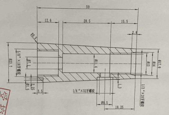 Utiliser un outil de tournage à 35° pour usiner la forme des pièces, puis utiliser un foret ∅7.1, des outils d'alésage ∅8 pour usiner le trou de fond ∅7.1 et le trou de fond à filetage 5/8 x18.